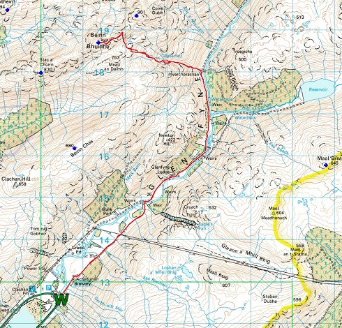 Note: cycling to gate where you are asked to leave your bike is mostly tarmac, rough but hard surface for the last 500 m, and no steep slopes. The track to Inverchorachan could be cycled, but has stiffer climbs.